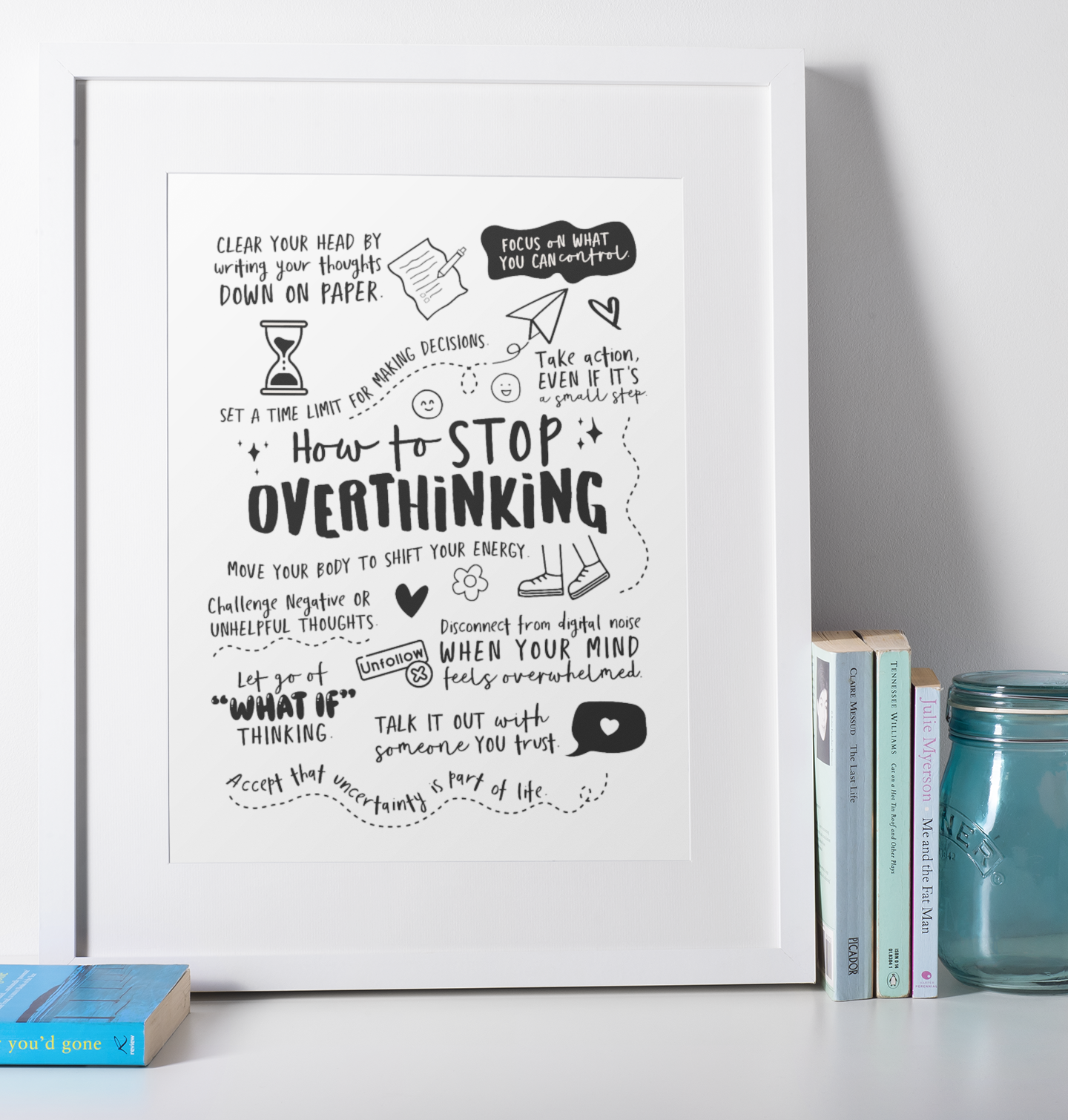 Stylowy plakat afirmacyjny How to stop overthinking w języku angielskim. Przypomina, jak wyciszyć natłok myśli. Format 18×24 cm w ramce. Drukowany lokalnie w Polsce. Idealny prezent i codzienna inspiracja.