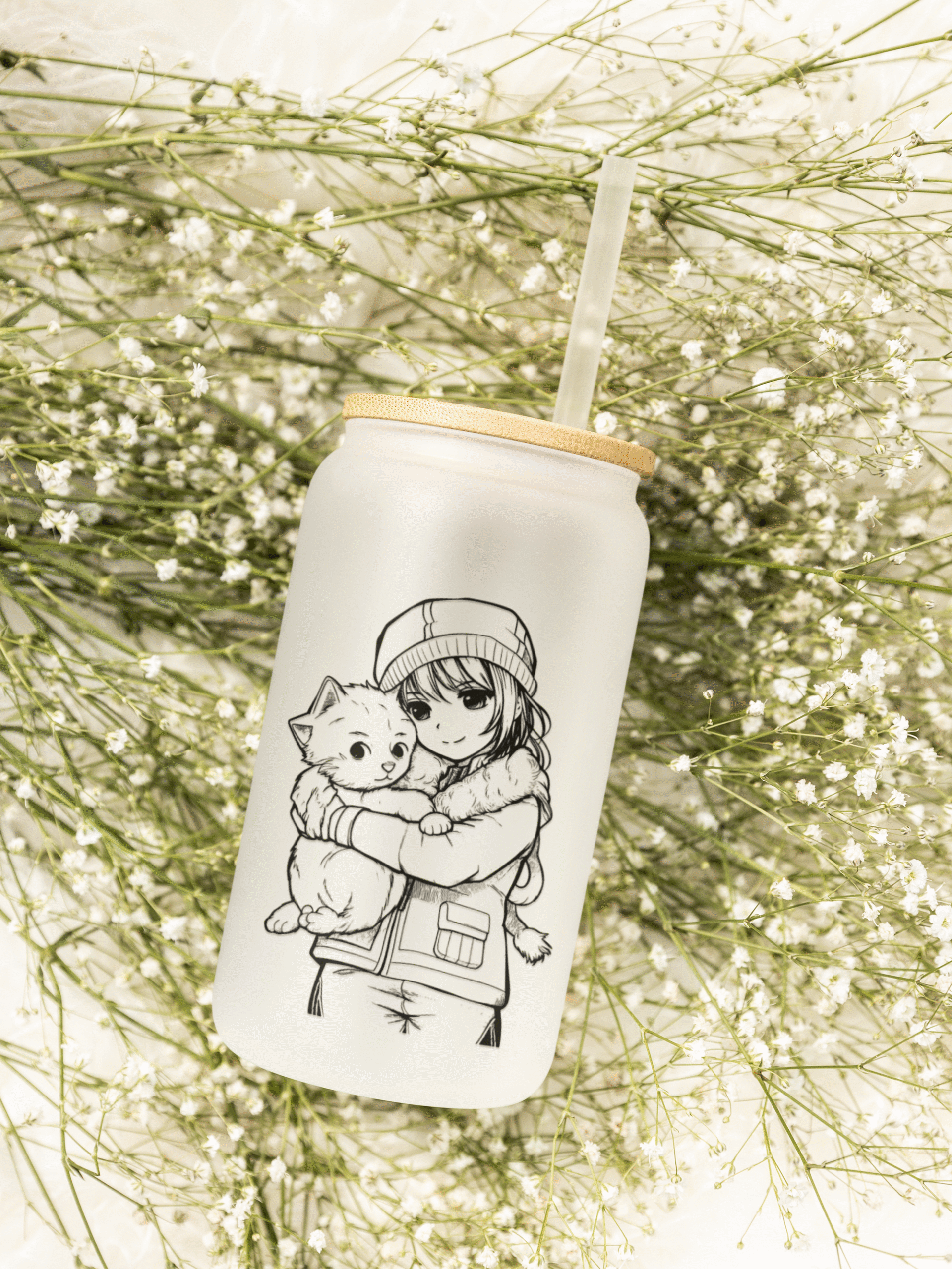 Szklanka 550 ml ze szkła z autorską naklejką UV DTF, bambusowym wieczkiem i szklaną słomką. W zestawie czyścik do słomki i bambusowa podkładka w kształcie kwiatka. Stylowy, ekologiczny design – idealny na prezent. Tylko delikatne mycie ręczne.