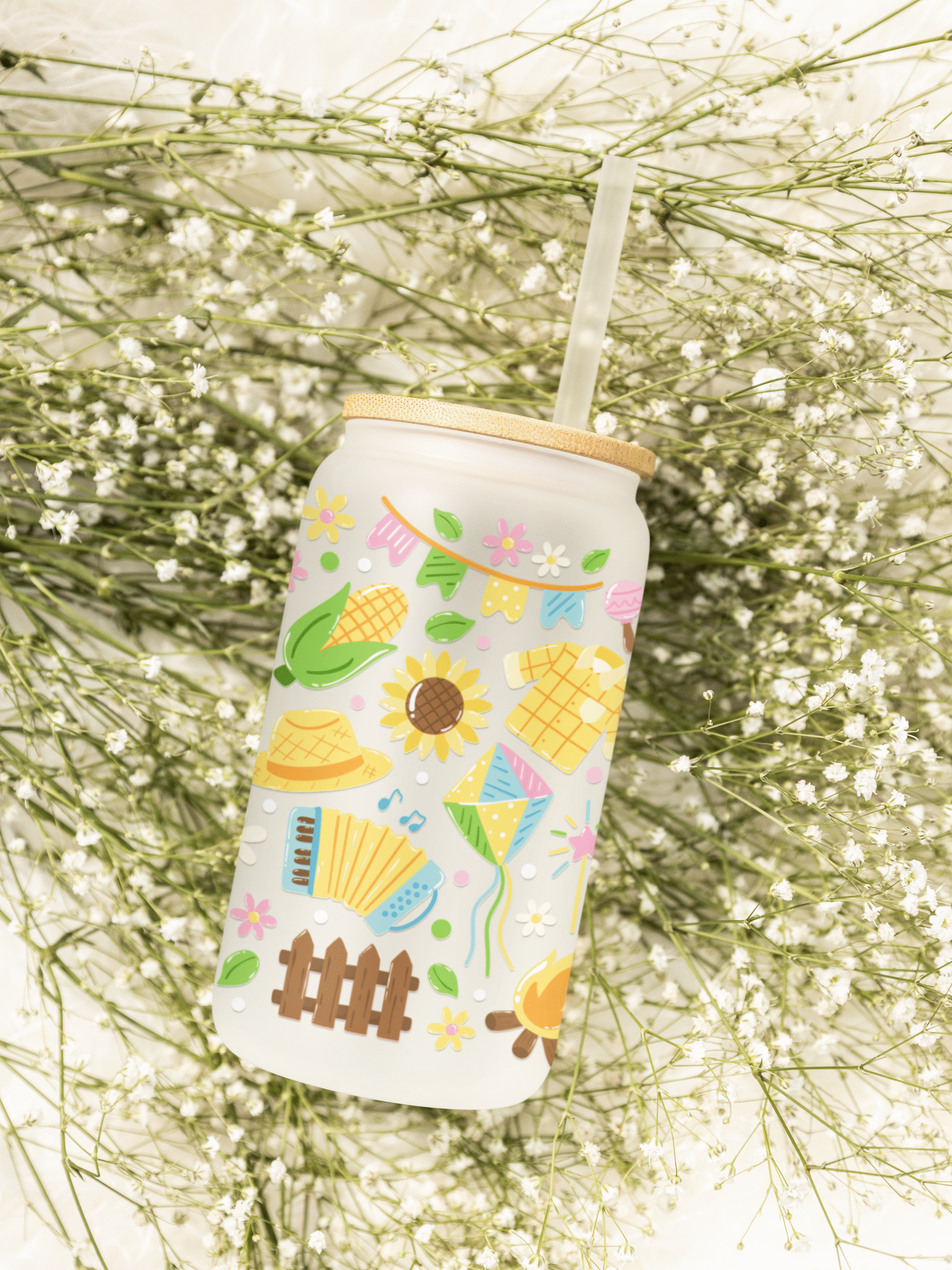 Szklanka 550 ml ze szkła z autorską naklejką UV DTF, bambusowym wieczkiem i szklaną słomką. W zestawie czyścik do słomki i bambusowa podkładka w kształcie kwiatka. Stylowy, ekologiczny design – idealny na prezent.