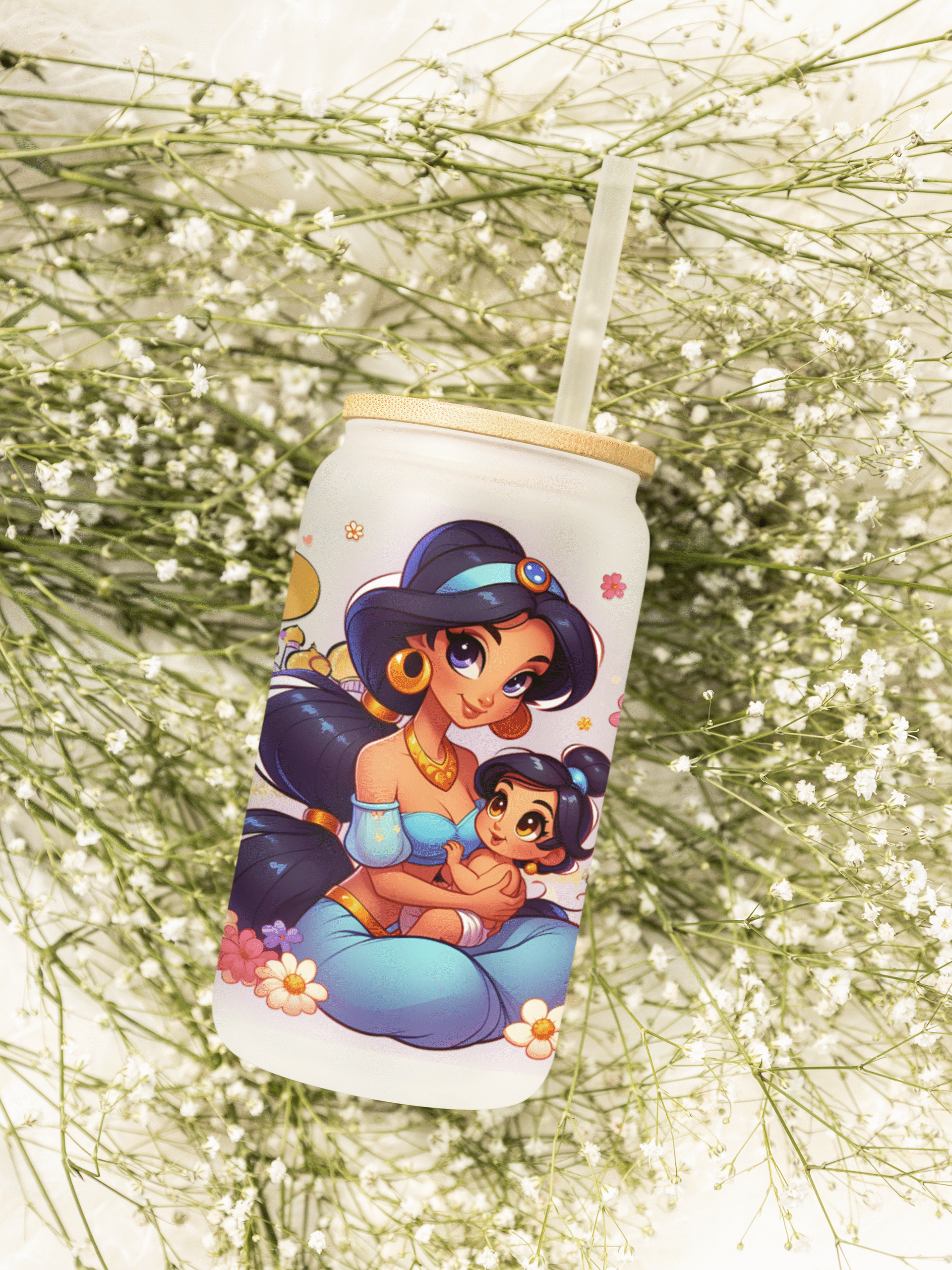 Szklanka 550 ml ze szkła z autorską naklejką UV DTF, bambusowym wieczkiem i szklaną słomką. W zestawie czyścik do słomki i bambusowa podkładka w kształcie kwiatka. Stylowy, ekologiczny design – idealny na prezent.