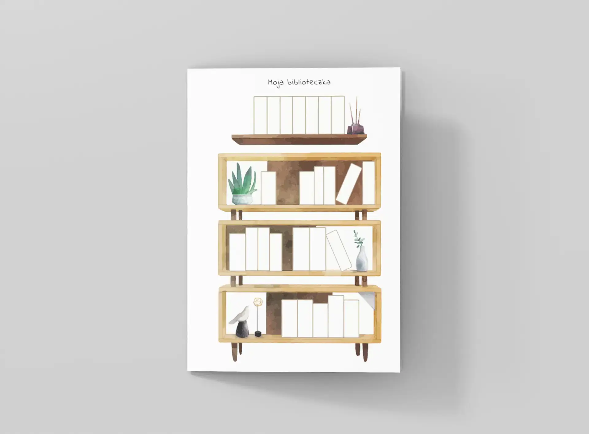 • ilustrację półki z książkami z roślinami i dekoracjami,