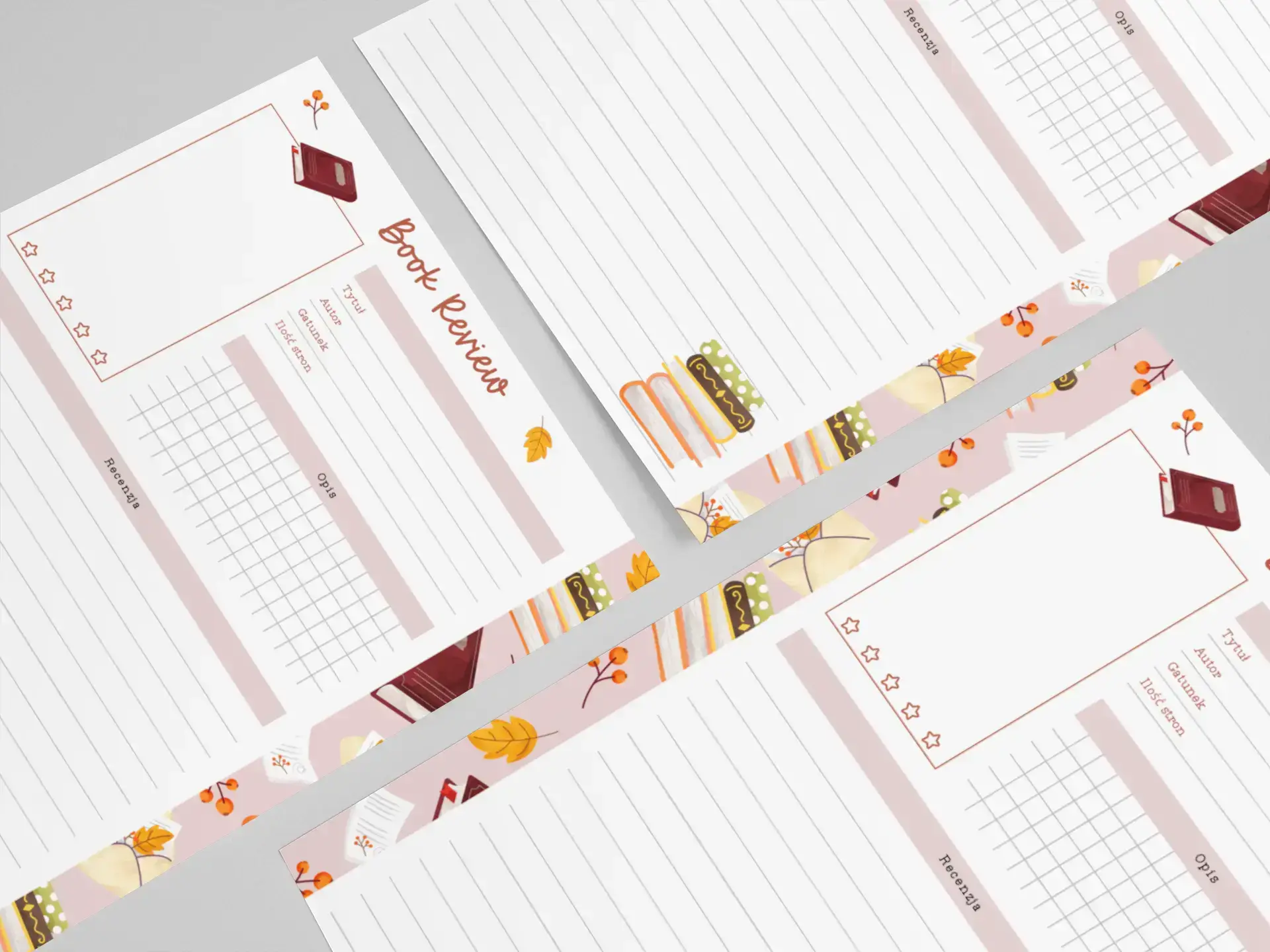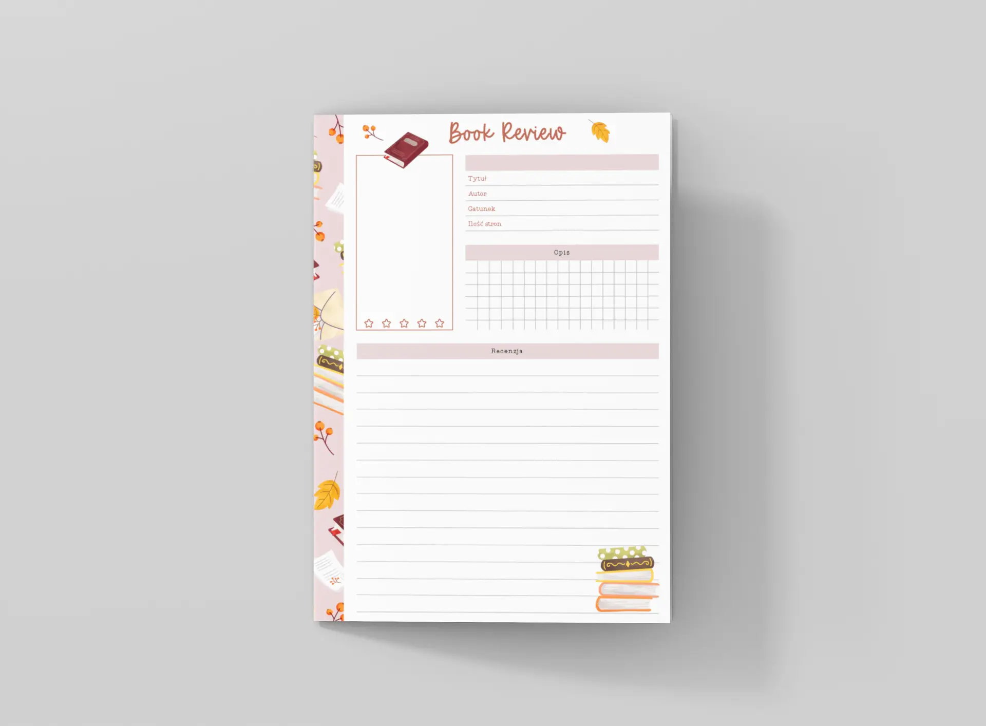 Kolorowy, ale nienachalny design z książkowymi motywami inspirowanymi jesienią sprawia, że pisanie recenzji staje się czystą przyjemnością. Tło i ilustracje nie przeszkadzają w pisaniu, a subtelne grafiki nadają całości wyjątkowy charakter.